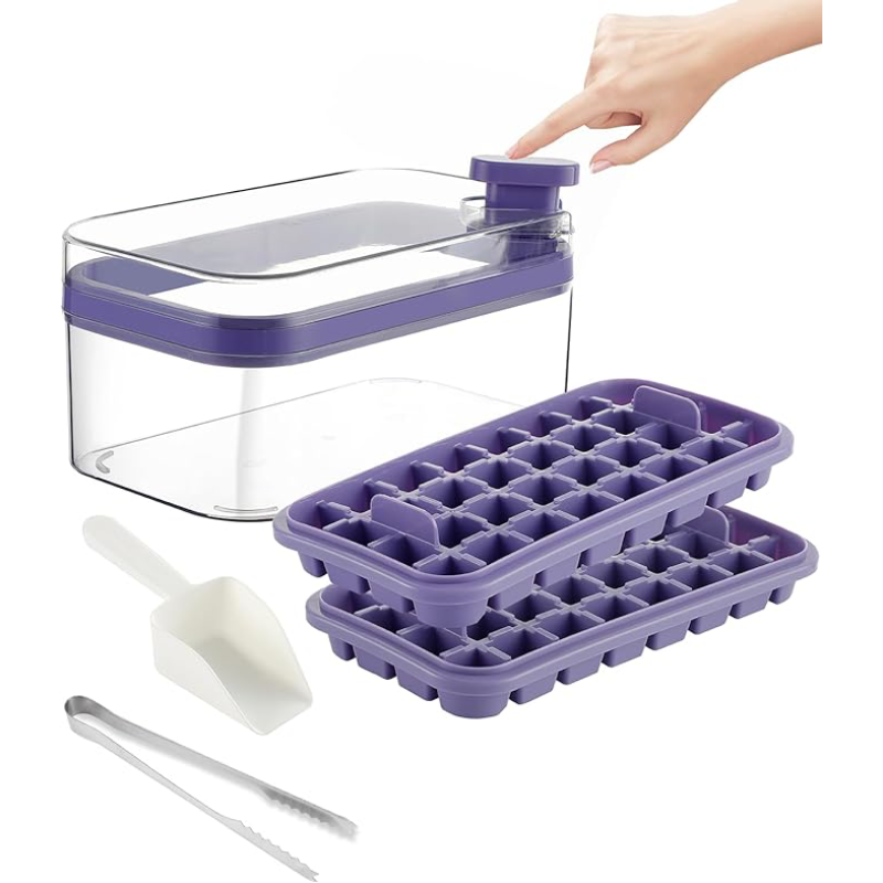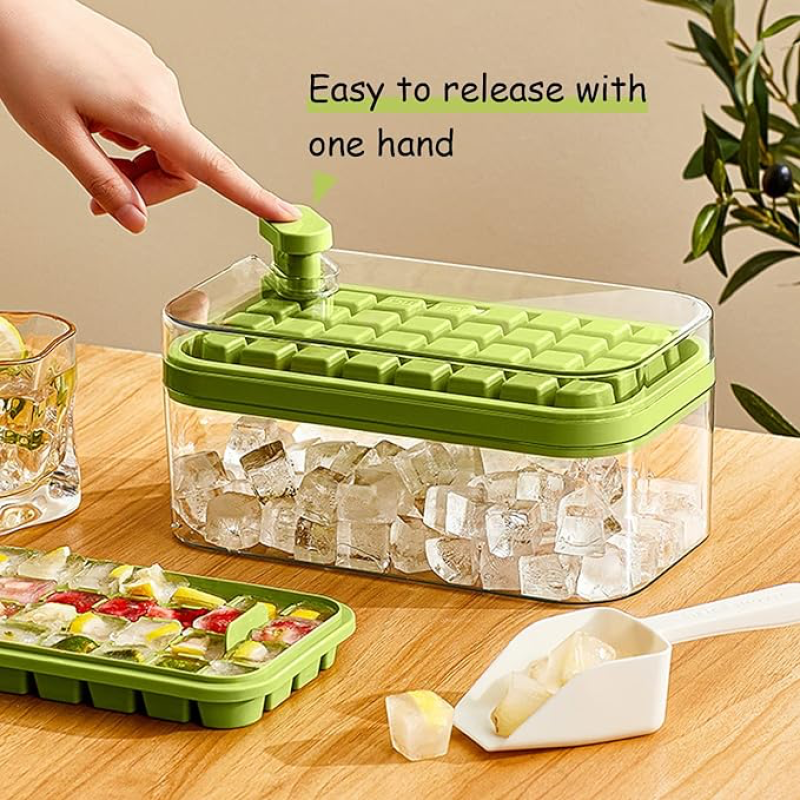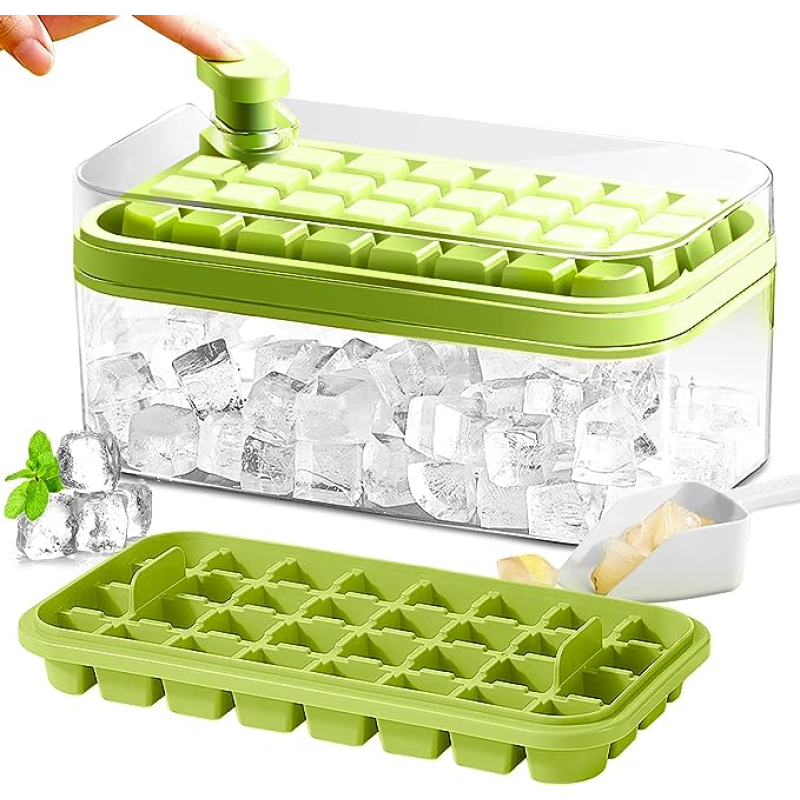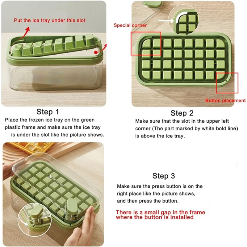 Bu buz kalıbı, yenilikçi bir çıkarma tasarımıyla donatılmıştır, bu da buz küplerini çıkarmayı kolaylaştırır. Sadece buz kalıbını doğru konuma yerleştirin ve parmağınızla kapaktaki yeşil düğmeye basın, buz küplerini kolayca çıkarabilirsiniz.